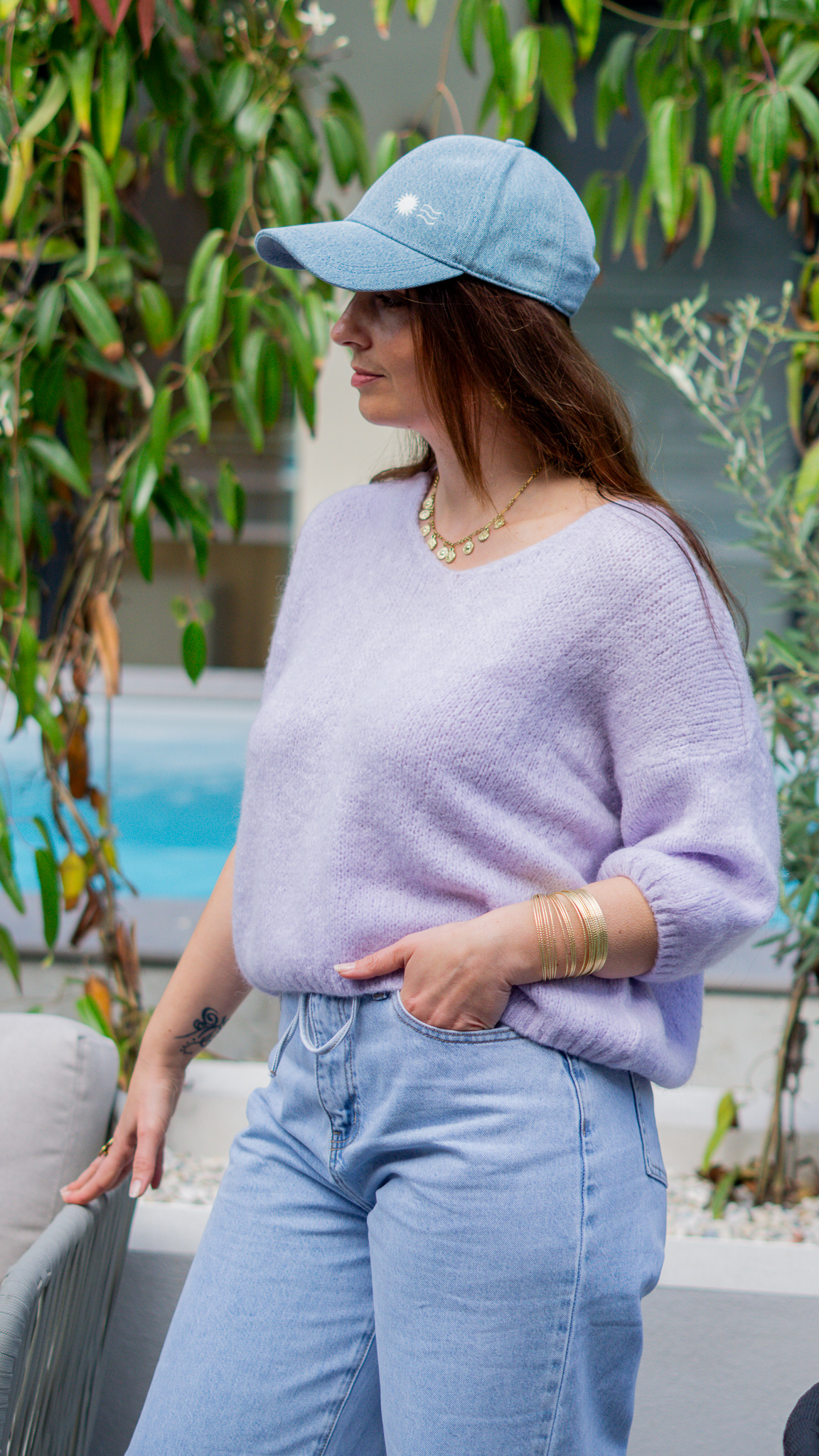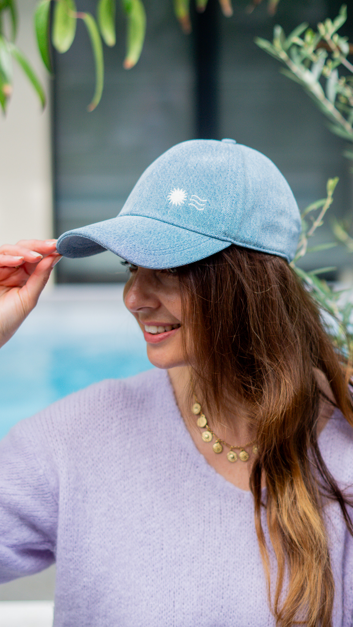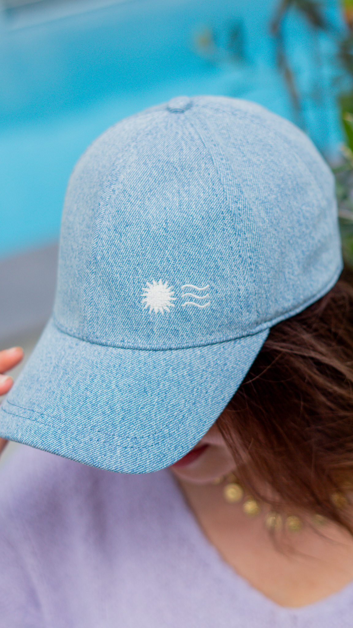 • Casquette en denim avec broderie soleil et vague.